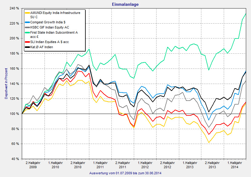 Drei Fonds der Peergroup tragen die FondsNote 5. Darunter der SLI Indian Equities (ISIN: LU0306632174) von Standard Life Invest. Der mit einem Volumen von knapp sieben Millionen Euro extrem kleine Fonds kommt im ersten Halbjahr 2014 auf ein Plus von 31,7 Millionen Euro. Vergangenes Jahr verlor er 14,5 Prozent. Über fünf Jahre ging es lediglich um 15,8 Prozent nach oben. Fondsmanager Alistair Way hat Finanztitel mit knapp 30 Prozent am stärksten gewichtet- Auf IT-Aktien und Materialien entfallen 18,8 Prozent bzw. 14,6 Prozent. Größte Einzeltitel sind der IT-Konzern Infosys Technologies (9,5 Prozent), die HDFC Bank (6,9 Prozent) und der Immobilienfinanzierer HDFC Ltd. (6,4 Prozent).