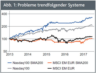 Hierbei können prinzipiell zwei Signale entstehen. Ein Einstiegssignal entsteht bei einem überschreiten der 200-Tage-Linie (SMA200). Ein Ausstiegssignal wird beim Unterschreiten der SMA200 generiert. In Abb. 1 werden zwei unterschiedliche Märkte dargestellt, auf welche der oben beschriebene, äußerst einfache Handelsmechanismus angewandt wurde. Isoliert betrachtet wäre die Investition eines Anlegers in amerikanische Technologiewerte/Nasdaq100 (blaue Linie) äußerst rentabel gewesen, während eine Investition in die Schwellenländer/MSCI EM (orange Linie) im gleichen Zeitraum lediglich von dürftigem Erfolg gekrönt gewesen wäre – erst recht im Vergleich zum Index.