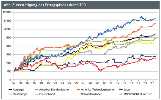 Deutliche Verbesserung des Risiko-/ Renditeverhältnisses im Aggregat gegenüber dem Gesamtmarkt (MSCI World (EUR)) durch die horizontale und vertikale TPD sowie gegenüber der reinen vertikalen TPD auf Einzelmarktebene.