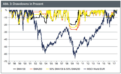 In der Folge werden pro Teilmarkt zwei Signale generiert, wobei der kürzere gleitende Durchschnitt, also der SMA130, frühere Ein- und Ausstiege definiert. In der praktischen Umsetzung wird nun die eine Hälfte der zu investierenden Summe entsprechend den Signalen durch die SMA200 und die andere Hälfte entsprechend den Signalen der SMA130 investiert oder eben desinvestiert. Abb. 3 verdeutlicht nun den Effekt der horizontalen und vertikalen TPD anhand der Drawdowns. Der Drawdown-Verlauf in der Grafik ergibt sich basierend auf der SMA130 (schwarze Linie), der SMA200 (rote Linie) und auf der gleichgewichteten Kombination der beiden Signalgeber (gelbe Linie). Die Kombination der beiden Indikatoren führt ebenfalls zu einer Beruhigung des Ertragspfades im Rahmen der zusätzlichen Anwendung der vertikalen TPD.