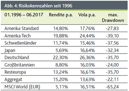 Dadurch ergibt sich eine deutliche Verbesserung der Risiko- und Ertragskennzahlen im Aggregat sowohl gegenüber den Einzelmärkten als auch gegenüber der Benchmark des Aggregats, dem MSCI World (siehe Abb. 2), und auch gegenüber global anlegenden Buy-and-hold-Aktienfonds. Vor allem aber ergibt sich ein robuster Ertragspfad mit konstanter Wertentwicklung. Die Schwankungsintensität (Volatilität) und das Ausmaß der vorübergehenden Einbrüche (Drawdowns) werden stark verringert. Dieser Diversifikationseffekt kommt maßgeblich durch die im Zeitablauf unterschiedlich stark ausgeprägten Trendphasen der einzelnen (Teil-)Märkte zustande.