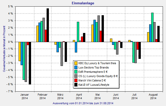 Diese Entwicklung wirkt sich auch auf Aktienfonds aus, die in diese Unternehmen investieren: Die Kategorie „Aktienfonds Luxus/Lifestyle“ des FINANZEN FundAnalyzer (FVBS) beendete das vergangenen Jahr mit einem durchschnittlichen Plus von 17,8 Prozent. Über drei Jahre ging es um 42,7 Prozent nach oben, über fünf Jahre sogar um 126 Prozent. Und 2014? Per 31. August notiert die Peergroup bei durchschnittlichen Verlusten von 0,5 Prozent.
