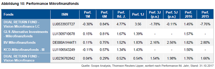 Einer Studie der Ratingagentur Scope zufolge existieren derzeit weltweit rund 130 Mikrofinanz-Anlageinstrumente, mit denen Anleger in rund 10.000 Mikrofinanzinstitute investieren können. Indien, Kambodscha und Kenia gehören zu den größten Mikrofinanz-Märkten.
