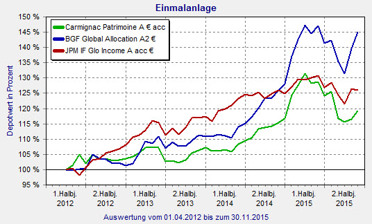 Der größte Mischfonds der Peergroup ist der Carmignac Patrimoine (ISIN: FR0010135103) - 25, 4 Milliarden Euro sind in den Fonds investiert. Bisher erreicht der Fonds einen Zuwachs von 2,2 Prozent in 2015. Auch über vier Jahre können die Fondsmanager Edouard Carmignac und Rose Ouahba noch nicht wirklich überzeugen, der Fonds erhält die FondsNote 3 – sie misst das Rendite-Risiko-Verhältnis. Über 20 Jahre jedoch erzielt der Fonds eine Wertentwicklung von 435,3 Prozent - mehr als die 20-Jahre-Performance aller anderen Fonds im Vergleich. 1,78 Prozent beträgt die TER für das Schwergewicht.