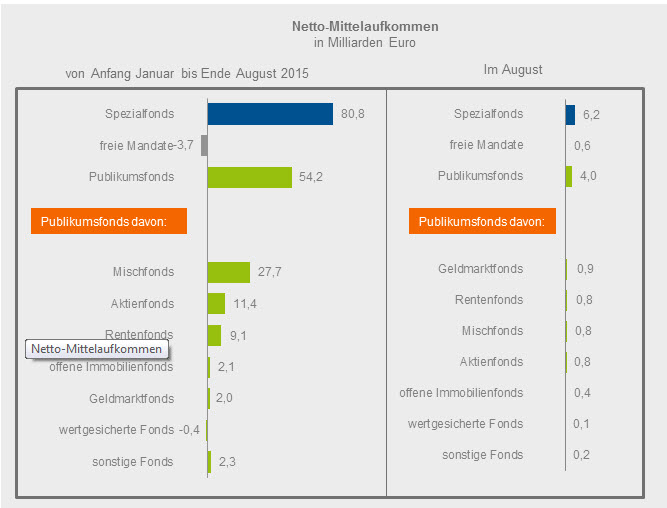 Im August sammelte die Fondsbranche netto 10,8 Milliarden Euro ein. In Spezialfonds flossen 6,2 Milliarden Euro, in Publikumsfonds vier Milliarden Euro und freie Mandate steuern insgesamt 0,6 Milliarden Euro an neuen Gelder bei. Im Juli hatten die Nettozuflüsse noch bei 11,4 Milliarden Euro gelegen.