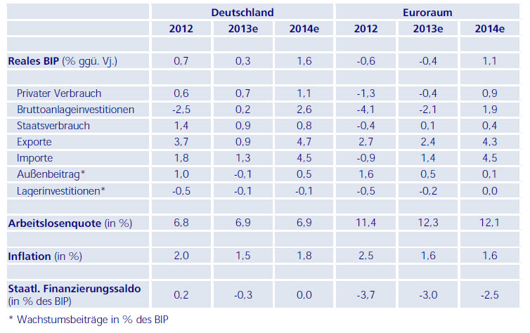 „Vor diesem Hintergrund halten wir an unserer Erwartung einer allmählichen konjunkturellen Erholung fest“, fügt Bayer optimistisch an. „Aufgrund des schwachen Jahresauftaktes senken wir allerdings unsere BIP-Prognosen 2013 für Deutschland von 0,6 Prozent auf 0,3 Prozent, die für die EWU von -0,1 Prozent auf -0,4 Prozent.“ Für das kommende Jahr rechnet er mit unverändert mit Wachstumsraten von 1,6 Prozent bzw. 1,1 Prozent.
