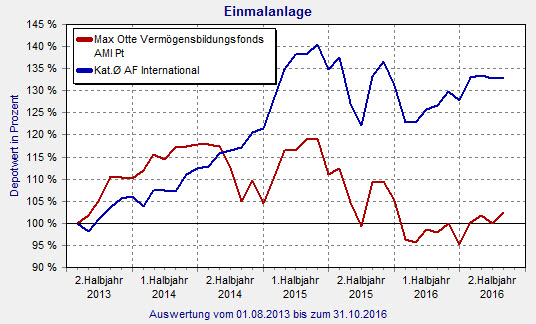 Auch der Max Otte Vermögensbildungsfonds (ISIN: DE000A1J3AM3) hält nicht was er verspricht. Zwar steht im laufenden Jahr nur ein Verlust von 2,4 Prozent zu Buche, doch hinkt das Fondsmanagement seit einiger Zeit der Peergroup Aktienfonds International hinterher.