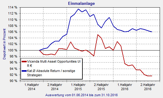 Starke Nerven brauchen darüber hinaus die Investoren des Vicenda Multi Asset Opportunities (ISIN: DE000A1W9CH) von Felix Zulauf. Während die Peergroup Absolute Return/Sonstige Strategien „nur“ mit 1,8 Prozent in den roten Zahlen steht, verliert der Vicenda-Fonds zum 31. Oktober bereits 8,4 Prozent. Aufgelegt wurde der Fonds im Mai 2014. Aktuell beträgt das Fondsvermögen 16,6 Millionen Euro. Investiert wird in die Schweiz, in Kanada und in den USA. 1,4 Prozent investiert das Fondsmanagement in Barrick Gold, 1,1 Prozent in Newmont Mining. Anlegern stellt der Fonds 2,39 Prozent TER in Rechnung.