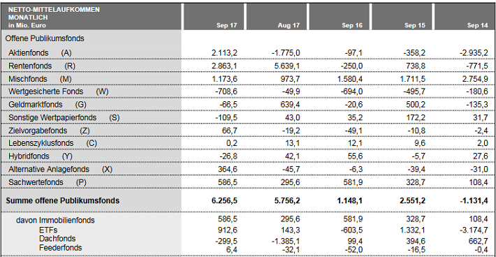 Rund fünf Milliarden Euro sammelten Aktien- und Rentenfonds ein. Das ist eine erstaunlich hohe Summe, wenn man sich die Septemberstatistiken der vergangenen drei Jahre ansieht. Da mussten Aktienfonds regelmäßig Abflüsse hinnehmen, und auch Rentenfonds verbuchten nur vor zwei Jahren einmal ein Plus.
