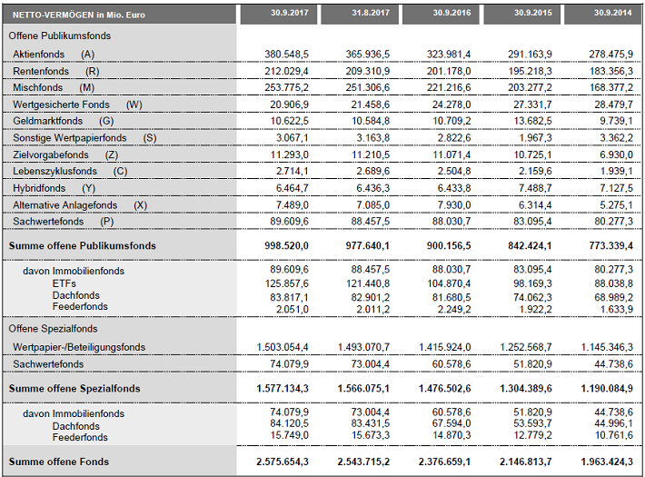 Mit den September-Zuflüssen ist das in Deutschland in Publikumsfonds investierte Vermögen offiziell auf knapp unter eine Billion Euro angewachsen. Zum Zeitpunkt der Veröffentlichung Mitte November kann davon ausgegangen werden, dass die Billionengrenze mittlerweile deutlich überschritten ist. Etwa 40 Prozent davon sind in reinen Aktienfonds investiert.