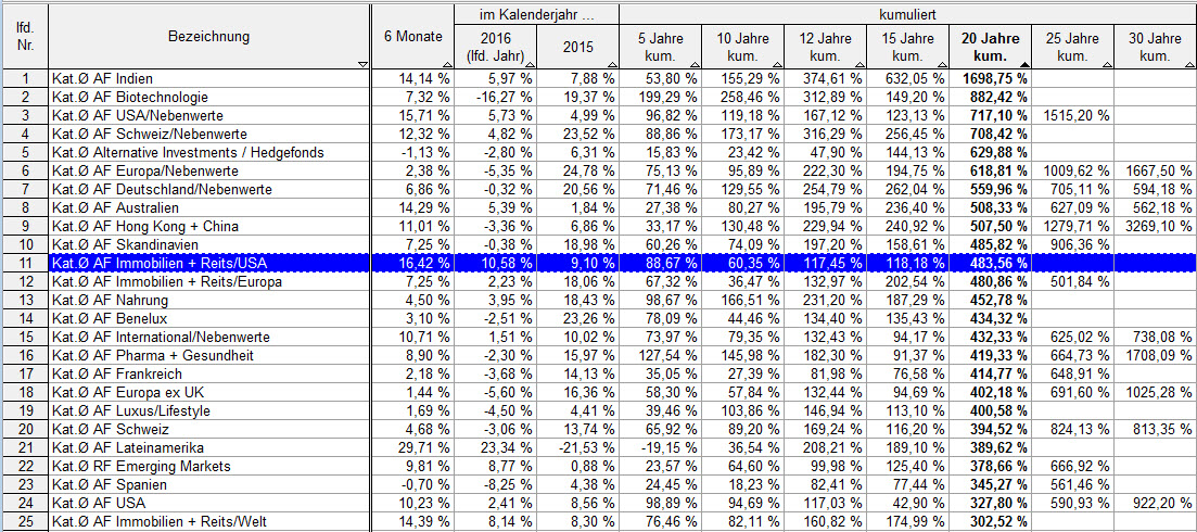 Klar an der Spitze nach 20 Jahren: Die Assetklasse "Aktienfonds Indien" mit 1.698 Prozent Plus. Das sind 15,5 Prozent Zuwachs pro Jahr - was sicherlich für so manchen temporären Rückschlag entschädigt. Auf Platz zwei kommt die Klasse "Biotechnologie", die in 20 Jahren 882 Prozent zulegen konnte, gefolgt von den ewigen Favoriten "USA/Nebenwerte" und "Schweiz Nebenwerte". Die bestplatzierte Assetklasse, die nicht ausschließlich in Aktien investiert, ist die Kategorie "Alternative Investments". Sie landet auf Platz fünf mit einem Plus von 629 Prozent. Beachtlich auch: Die Kategorie "Immobilien + REITS/USA", auf Platz elf, mit einem Plus von 483 Prozent. Und natürlich die Klasse Aktienfonds „Hong Kong + China“: Platz neun im 20-Jahres-Vergleich. Platz 1 über 30 Jahre mit einem Zuwachs von 3.269 Prozent – das war nicht zu toppen - und erst im Nachhinein wie ein Sieg mit Ansage.