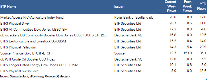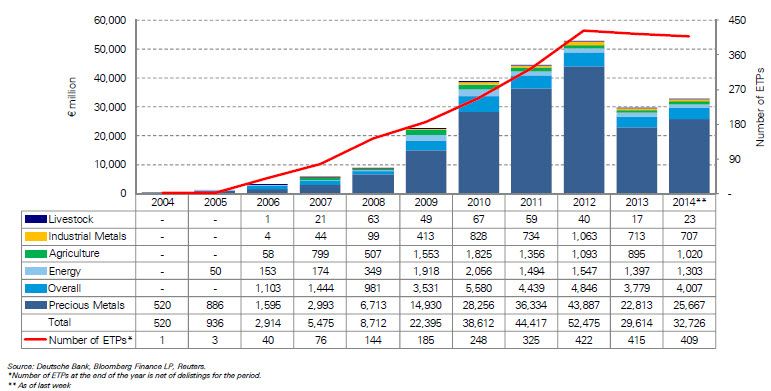 Nach einem Rückgang 2013 legen Anleger wieder vermehrt in Rohstoff-ETPs an. Edelmetallprodukte am beliebtesten.