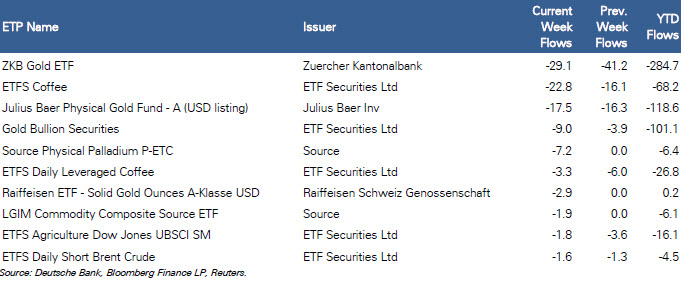 Die höchsten Abflüsse im laufenden Jahr verzeichnet der ZKB Gold ETF von der Züricher Kantonalbank. Er verlor 284,7 Millionen Euro. Ebenfalls starke Verluste musste der Julius Baer Physical Gold Fund A hinnehmen. Anleger zogen 118,6 Millionen Euro ab. Ein Minus im dreistelligen Bereich gibt es mit 101,1 Millionen Euro auch für den Gold Bullion Securties.