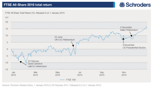 The Brexit process started on 20 February 2016 when then Prime Minister David Cameron called a referendum on the UK’s membership of the EU. The news saw a decline in the value of sterling, although stockmarkets experienced a more muted reaction. External events, such as worries over China’s economy, were also affecting markets in early 2016.