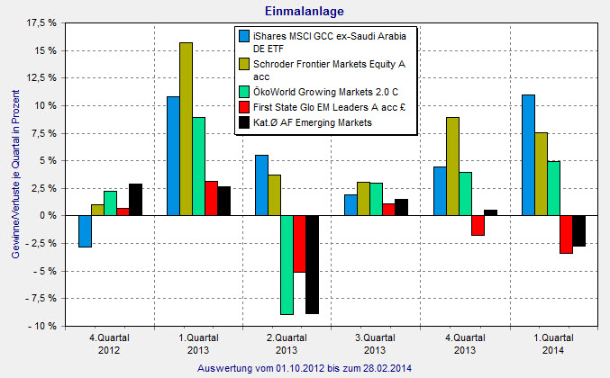 Klar, im Peergroup-Durchschnitt ist kein Anleger investiert und mit Durchschnitten ist immer so eine Sache. Daher lohnt sich ein Blick in die Peergroup. Trotz der zuletzt negativen Performance der Peergroup, gibt es einige Perlen, mit denen sich auch in schweren Zeiten Geld verdienen lässt. Zum Beispiel der iShares MSCI GCC ex-Saudi Arabia (ISIN: DE000A0RM470). Der ETF mit einem Volumen von 15,8 Millionen Euro ist auf die Golfstaaten beschränkt. Im Januar und Februar dieses Jahres katapultierte ihn das um elf Prozent nach oben. Für 2013 steht ein Plus von 24,6 Prozent und im Zeitraum von zwei Jahren erreicht der Fonds eine kumulierte Wertentwicklung von 40,6 Prozent.