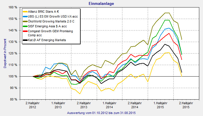 Zumindest im vergangenen Jahr hatten Anleger noch Spaß an den Schwellenländern. Die Kategorie „Aktienfonds Emerging Markets“ des FINANZEN FundAnalyzer (FVBS) legte um durchschnittlich 10,2 Prozent zu. Das sieht im laufenden Jahr schon wieder anders aus: 2015 ging es bisher (Stand: 31. August 2015) um fünf Prozent nach unten. Allein für August, als Chinas Börsen crashten, steht ein Minus von 10,6 Prozent.