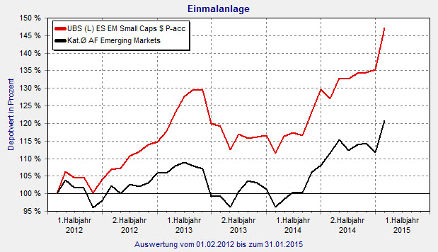Dass die Wachstumsstory des Binnenkonsums in den Schwellenländern nicht nur bloß eine Geschichte ist, beweist UBS mit dem Equity Emerging Markets Small Caps Fonds (ISIN: LU0727654609). Der Fonds, der von Stephen Derkash gemangt wird, feierte Ende Januar seinen dritten Geburtstag. Als Geschenk gab es eine Wertsteigerung von 47,2 Prozent seit Auflegung. Wie stark diese Entwicklung ist, zeigt erst ein Blick auf die Peergroup „Aktienfonds Emerging Markets“, die im selben Zeitraum durchschnittlich nur 20,9 Prozent einbrachte – weniger als die Hälfte der Fonds-Performance. Das Jahr 2014 beendete Derkash mit einem Plus von rund 16 Prozent und der Start in 2015 kann sich mit 8,9 Prozent allein im Januar durchaus sehen lassen.