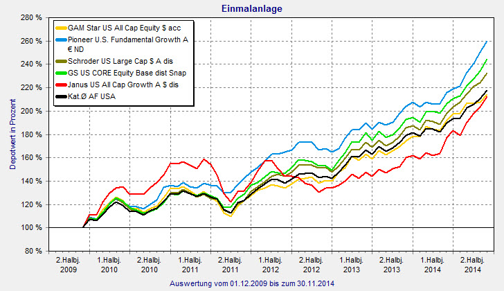Von diesem positiven Umfeld profitieren auch US-Aktienfonds. Die Kategorie „Aktienfonds USA“ des FINANZEN FundAnalyzer (FVBS) steigerte ihren Wert im laufenden Jahr (per. 30. November 2014) um knapp 20 Prozent. Zum Vergleich: Für deutsche Aktienfonds ging es im selben Zeitraum um lediglich 2,8 Prozent nach oben.