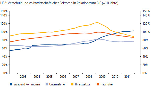 Die Schlagzeilen der vergangenen Monate wurden dominiert von Krisenmeldungen: Konflikte im Nahen Osten, Reaktorunglück in Fukushima, Anhebung der US-Schuldengrenze, Kreditherabstufung der USA durch Standard & Poors und die Zuspitzung der europäischen Schuldenkrise. Untergegangen ist dabei, dass US-Unternehmen, abgesehen vom Finanzsektor, im Gegensatz zu Staat und Kommunen ihre Schulden in den vergangenen zehn Jahren nahezu konstant hielten, beziehungsweise nach der Finanzkrise sogar abbauten. Das geht aus einer aktuellen Studie von Allianz Global Investors hervor. Ein Blick auf die volkswirtschaftlichen Sektoren zeige, dass die Verschuldung von Staat und Kommunen in Relation zum Bruttoinlandsprodukt (BIP) seit 2002 zwar von ca. 50 Prozent auf knapp 100 Prozent bis Ende 2011 gestiegen sei. Die Verschuldungsquote der Unternehmen habe sich mit aktuell rund 70 Prozent aber kaum verändert. Sogar der Finanzsektor und die privaten Haushalte schafften der Studie zufolge – in Relation zum BIP – einen Abbau der Schulden.