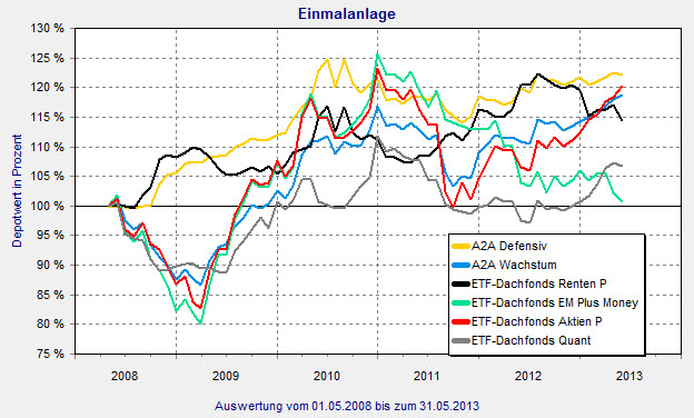 Die Fondverschmelzungen werden zum 18. September vollzogen. Der A2A Wachstum (ISIN: DE0005561641) und der ETF-Dachfonds Renten (ISIN: DE0005561690) werden auf den A2A Defensiv verschmolzen. Der ETF Dachfonds Quant (ISIN: DE0005561625) und der ETF-Dachfonds Emerging Markets Plus Money (ISIN: DE0009763326) werden Teil des ETF-Dachfonds Aktien (ISIN: DE0005561682), der künftig ETF-Allocation Emerging Markets heißt.