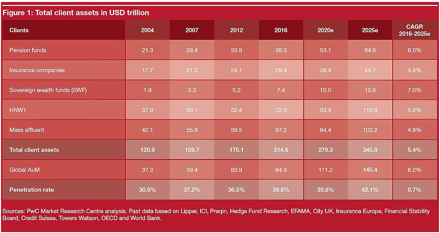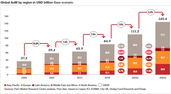 Die zunehmende Bedeutung des asiatischen Markts spiegelt sich auch im wachsenden Einfluss sogenannter Sovereign Wealth Funds. Das sind Fonds, die ausschließlich staatliches Vermögen anlegen und die unter anderem in China, Hongkong und Singapur anzutreffen sind. Das Vermögen dieser Fonds wird laut PwC-Studie bis 2025 um durchschnittlich 7,0 Prozent jährlich wachsen und damit stärker als jedes andere Segment.
