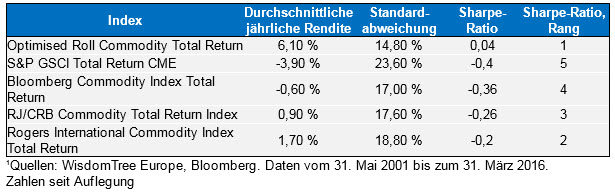 Der im EBCIWTT integrierte optimierte Rollmechanismus soll die Rollrenditen maximieren und zugleich die Rollkosten minimieren, welche mit der Fortführung der Engagements in den im Index enthaltenen Rohstoffen verbunden sind. Erreicht wird dieses Ziel durch einen dynamischen, regelbasierten Ansatz für das Rollen von Futures-Kontrakten. Die Ergebnisse dieser optimierten Rollstrategie sprechen für sich: Im Vergleich zu anderen Benchmark-Indizes für Rohstoffe – wie dem S&P GSCI Total Return, dem Bloomberg Commodity Index und dem Thomson Reuters CRB – ergaben sich durchgängig höhere Renditen und niedrigere Risiken.