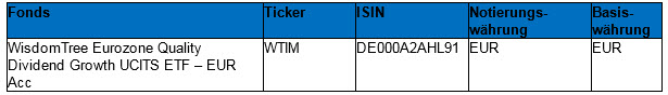 WisdomTree, Anbieter von Exchange-Traded-Fonds („ETF“) und Exchange-Traded-Produkten („ETP“), gibt heute bekannt, dass er den Handel mit dem WisdomTree Eurozone Quality Dividend Growth UCITS ETF (WTIM) an der Deutschen Börse Xetra aufnimmt. Der ETF ergänzt das bestehende Angebot an ETFs, die auf Dividendenwachstum setzen. Im letzten Monat hat die Firma bereits die folgenden ETFs an der Börse eingeführt: WisdomTree US Quality Dividend Growth UCITS ETF (WTDM) und WisdomTree Global Quality Dividend Growth UCITS ETF (WTEM).