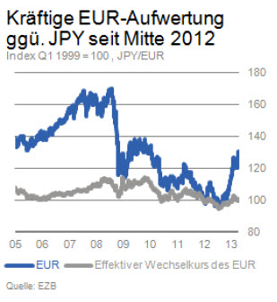 Seit Mitte des vergangenen Jahres wertete der JPY gegenüber dem Euro bereits um rd. 40% ab und notiert damit so schwach wie zuletzt vor etwa vier Jahren. Seit dem Tief 2012 sorgte anfänglich die Beruhigung in der Eurozone und dann verstärkt der Regierungswechsel in Japan für die Abwertung der japanischen Währung. Der japanische Premierminister Shinzo Abe forderte bereits im Wahlkampf eine 180°-Wende in der bisherigen Politik, insbesondere eine aggressive Lockerung der Geldpolitik. Dieser geldpolitische Regimewechsel wird als Gefahr für übrige Exportnationen – insbesondere Deutschland – gesehen. Für Deutschland ist diese Sorge aber nur bedingt berechtigt.