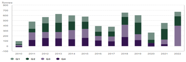 Da China weltweit der größte bzw. zweitgrößte Abnehmer von physischem Gold ist, sollte eine Öffnung und Erholung der chinesischen Wirtschaft für einen starken Nachfrageschub beim Gold sorgen. Insbesondere die chinesische Notenbank gehört zu den wichtigsten Käufern und stockt sukzessive ihre Goldreserven auf. Zentralbanken kauften allein in Q3/2022 ca. 400 Tonnen Gold und erzielten eine der größten Quartalsnachfragen seit Aufzeichnung.