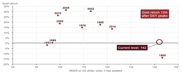 Peak USD war historisch ein starkes Signal für Gold: In 80% der Fälle hat Gold innerhalb der folgenden 12 Monate einen positiven Ertrag abgeworfen (+14% im Durchschnitt und +16% im Median).