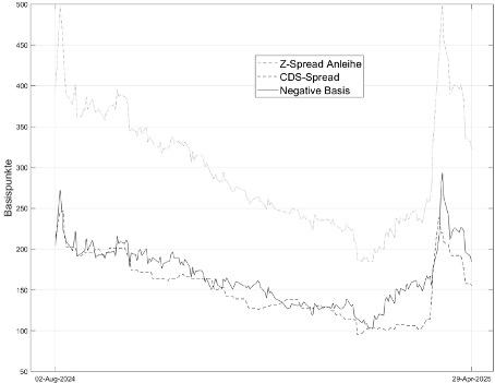 Abbildung 2 : Entwicklung der negativen Basis für die Anleihe RAKUTEN 11.25 USD 02/15/2027 von August 2024 bis Ende April 2025.
