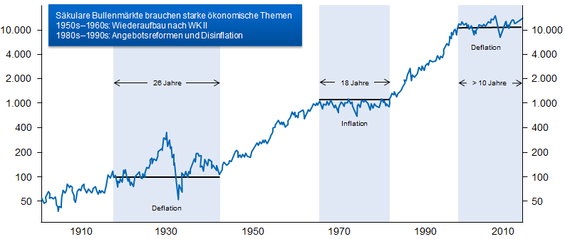 „Die aktuell hohe Volatilität an den Märkten versperrt die Sicht auf die langfristige Perspektive“, kommentiert Oliver Pfeil die momentane Lage der internationalen Märkte. Derzeit befinde sich der US Dow Jones Industrial Average (DJIA)in einer seit etwa zehn Jahren anhaltenden Seitwärtsbewegung. Als Fondsmanager für den US-amerikanischen Markt legt Pfeil vor allem auf diesen Index sein Hauptaugenmerk. Der Chart des DJIA reicht bis ins Jahr 1900 zurück und zeigt zwei weitere Zeiträume mit einer langen Seitwärtsbewegung: 1920 bis 1946 und 1965 bis 1983. „Seitwärtsphasen von zehn Jahren wie derzeit sind nichts Besonderes“, erläutert Pfeil. Für Dividenden seien sie sogar nützlich: In Seitwärtsmärkten seien Kurszuwächse selten, Ausschüttungen dagegen die Hauptrenditequelle.