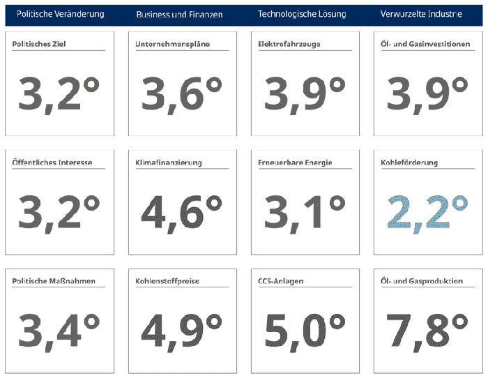 Innerhalb dieses Gesamtbildes haben sich durch aktualisierte Daten einige Veränderungen ergeben. So hat das öffentliche Interesse zugenommen, die Politik geht entschlossener vor und die Kohlenstoffpreise sind gestiegen. Für alle diese Faktoren gibt es jeweils eigene Temperaturindikatoren.