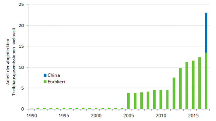 China treibt zurzeit ein Programm voran, das nahezu 10 % der weltweiten Treibhausgasemissionen abdecken wird(2). Bislang ist noch unklar, ob die ursprünglich geplanten 7 bis 8 Mrd. Tonnen von Anfang an abgedeckt werden oder zunächst nur mit bestimmten Branchen begonnen wird. Doch sind allein die Emissionen des chinesischen Energiesektors in Höhe von 3,7 Mrd. Tonnen riesig, wenn man sie mit den 1,7 Mrd. Tonnen vergleicht, die vom EU-Emissionshandel abgedeckt werden. (2 Diese Maßnahme soll normalerweise im November 2017 in Kraft treten; aktuellen Presseberichten zufolge könnte die vollständige Umsetzung jedoch erst 2018 beginnen.)