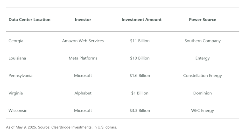 Abgesehen von den Zöllen sichern sich Stromversorger weiterhin neue Geschäfte im Zusammenhang mit dem Wachstum von KI und Rechenzentren, insbesondere in Nordamerika. Mehrere Versorgungsunternehmen haben kürzlich Rechenzentrumsprojekte und damit verbundene Upgrades ihrer Gewinnprognosen angekündigt. So hat beispielsweise der US-Hyperscaler Meta Platforms im Dezember einen 10-Milliarden-Dollar-Standort für ein Rechenzentrum in Nord-Louisiana angekündigt, das Entergy mit neuen gasbefeuerten Kraftwerken versorgen wird. Viele ähnliche Chancen und Ankündigungen gab es bei einer Reihe von Versorgungsunternehmen, die wir beobachten.