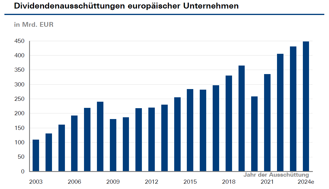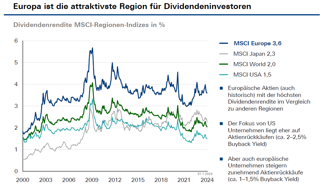 „Die Dividendenparty geht weiter. Nachdem 2023 ein neues Rekordjahr für Dividendenausschüttungen europäischer Unternehmen war, erwarten wir 2024 einen weiteren Anstieg. Wenn Anleger an regulären Ausschüttungen in Form von Dividenden interessiert sind, ist Europa die attraktivste Anlageregion – auch historisch. Europa ist sozusagen das Powerhouse der Dividende. Denn europäische Unternehmen sind im Vergleich zu US-Titeln häufig günstiger bewertet und bieten höhere Dividendenrenditen. Beispielsweise lag die Dividendenrendite Ende März im MSCI Europe bei 3,6 Prozent, im MSCI Japan bei 2,4, im MSCI World bei 2,1 und im MSCI USA bei nur 1,5 Prozent. Gleichzeitig sind die Ausschüttungsquoten europäischer Firmen nicht übertrieben hoch, sie liegen stabil zwischen 45 und 55 Prozent des Reingewinns. Wir haben daher große Positionen in Unternehmen aus Deutschland, Frankreich, Großbritannien, den Niederlanden und der Schweiz im Fonds. US-Unternehmen dagegen fokussieren sich eher auf Aktienrückkäufe.