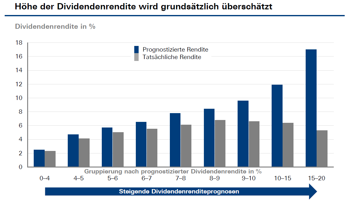 Der Fokus rein auf hohe Dividendenrenditen, wie ihn viele passive Strategien haben, ist jedoch gefährlich. Denn ab einer gewissen Höhe ist die Dividendenrendite eine Risikogröße und kein attraktives Investment mehr. Der Unterschied zwischen erwarteter und tatsächlich gezahlter Dividende kann enorm und die damit einhergehende Enttäuschung sehr groß sein. Daher bedarf es eines aktiven Investmentprozesses, um langfristig erfolgreiche Unternehmen mit nachhaltig steigenden Dividendenzahlungen zu selektieren.