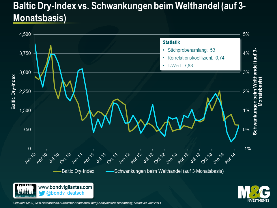 Sagt also der Baltic Dry-Index irgendetwas über den Welthandel und das Weltwirtschaftswachstum aus? Dieser Frage standen wir zunächst skeptisch gegenüber – zwar besteht hierbei seit jeher ein gewisser Zusammenhang (wir haben bereits 2011 hier darüber berichtet), aber hat dieser Indikator angesichts des enormen Anstiegs des Angebots an Schiffsfrachtraum inzwischen möglicherweise an Aussagekraft eingebüßt? Es hat sich jedoch herausgestellt, dass die Korrelation zwischen dem Welthandel und dem BDI sogar EXTREM aussagekräftig ist. Das CPB Netherlands Bureau for Economic Policy Analysis erstellt den monatlich erscheinenden CPB World Trade Monitor. Aus diesen Daten zum Welthandel geht eindeutig hervor, dass die Handelsvolumina seit den letzten Monaten des Jahres 2013 gesunken sind. Im Mai hat der Welthandel im Vergleich zum Vormonat sogar um 0,6 Prozent nachgelassen, obwohl man aufgrund von Schwankungen und saisonalen Effekten eher einen rollierenden 3-Monatsvergleich gegenüber dem vorangegangenen 3-Monatszeitraum bevorzugt. Wie die nachfolgende Grafik zeigt, hat das Wachstum des Welthandels nach einer sehr guten Entwicklung im Jahr 2010 in den letzten Jahren eher stagniert, und auch die kurzzeitige Erholungstendenz von Mitte 2013 ist inzwischen verpufft. Im I. Quartal dieses Jahres hat der Trend des Welthandels dann sogar ins Minus gedreht. Wir haben dieser Welthandels-Kennzahl den Baltic Dry-Index gegenüber gestellt – auf den ersten Blick scheint zwischen diesen beiden Indikatoren kein enger Zusammenhang zu bestehen, doch mit 0,74 ist der Korrelationskoeffizient hoch, während der T-Wert bei 7,83 liegt (dies spricht für eine extrem hohe statistische Signifikanz).
