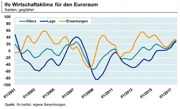Carstensen: In Europa stellt sich konkret die Frage, wie hart der Brexit tatsächlich ausfällt – wobei sich ein Abwarten womöglich als Sackgasse herausstellen könnte. Auch ist längst nicht sicher, dass nach der Eurokrise tatsächlich wieder alles in Butter ist. Die Krisenresilienz in vielen Staaten ist nämlich noch sehr gering und die Anfälligkeit nach unerwarteten Schocks entsprechend hoch. Doch derzeit überwiegen die positiven Nachrichten. So verzeichnen wir nach dem Brexit-Votum vom vergangenen Jahr einen Turnaround: Das ifo-Wirtschaftsklima für den Euroraum liegt bei etwa 30 Punkten und zeigt nach oben.