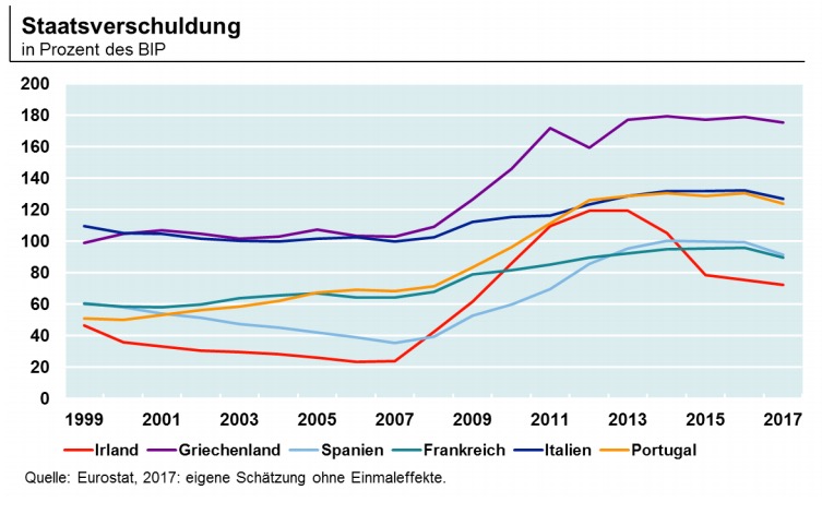 Die Staatsdefizite befinden sich jedenfalls auf dem Rückzug. Ein Finanzierungsdefizit von drei Prozent hat sich hier als gute Marke erwiesen, wenngleich man daraus keinen Zielwert machen sollte: in guten Zeiten dürfen auch einmal Schulden getilgt werden, um Luft für die nächste Rezession zu schaffen, die irgendwann bestimmt kommt. Doch selbst wenn das gelingt, braucht der Abbau der Staatsverschuldung Zeit, vor allem in Griechenland. Der Schuldenschnitt von 2012 hat nicht gereicht. In Spanien wiederum ist die Staatsverschuldung in den vergangenen zehn Jahren von 40 auf 100 Prozent gestiegen. Wenn jetzt eine neue Krise kommt, wird es für Spanien eng, dann rebellieren die Investoren.