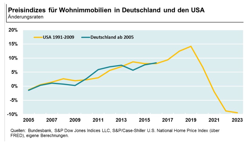 Allerdings ziehen die Hauspreise derzeit kräftig an: Wenn wir die Preisindizes für Wohnimmobilien in den USA von 1991 bis 2009 mit denen in Deutschland ab 2005 vergleichen (Grafik 3), sehen wir, dass hohe und zunehmende Änderungsraten nicht über einen längeren Zeitraum durchzuhalten sind. Wenn die Entwicklung in Deutschland auch 2019 noch derjenigen der USA ähnelte, wäre das ein Alarmsignal.