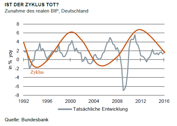 Das ist kein rein deutsches Phänomen. Es tritt auch in an deren Ländern und in der Weltwirtschaft insgesamt auf. Das kann nicht zufällig sein. Es ist keine normale Abweichung vom Zyklus. Der Zyklus wurde vielmehr insgesamt außer Kraft gesetzt.