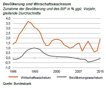 Das klingt angesichts der vielen Klagen über den Flüchtlingszustrom auf den ersten Blick überraschend. Es ist jedoch eine uralte Erkenntnis der Wissenschaft, dass die Bevölkerung eine der entscheidenden Determinanten der wirtschaftlichen Entwicklung ist. Bevölkerungsreiche Länder haben unter sonst gleichen Umständen ein größeres Sozialprodukt (siehe China oder Indien). Länder mit hohem Bevölkerungswachstum haben normalerweise auch eine höhere wirtschaftliche Dynamik. Die Grafik zeigt die Entwicklung in Deutschland in den letzten 35 Jahren. Der Zusammenhang ist klarer erkennbar, als ich gedacht hatte.