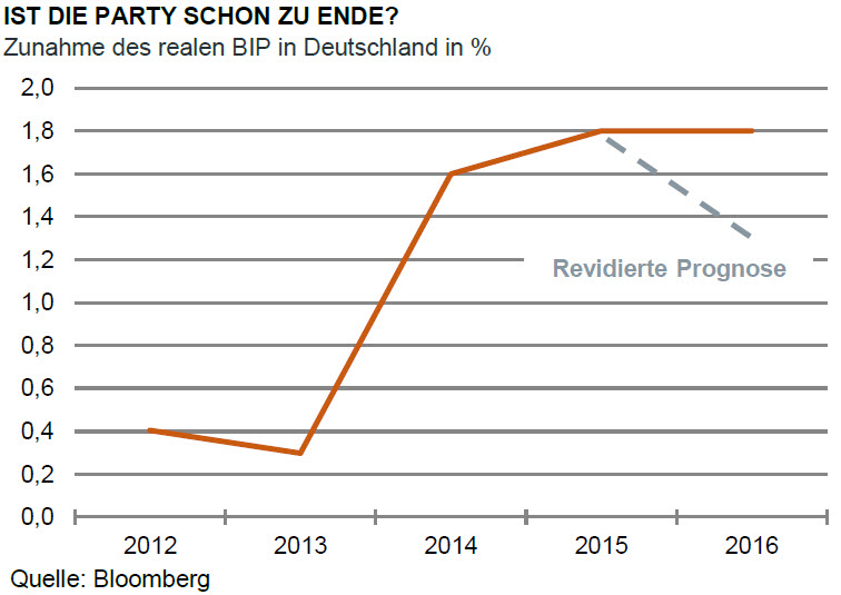 Ich fange an, die bisherigen Konjunkturprognosen in Frage zu stellen. Bisher gingen die meisten davon aus, dass sich der Aufschwung in Deutschland 2016 fortsetzen, vielleicht sogar leicht beschleunigen wird. Jetzt mache ich ein Fragezeichen dahinter.
