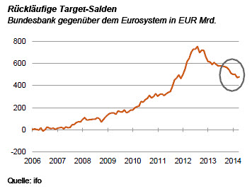 Um das an einem Bild festzumachen (siehe Grafik): Die Target-Salden der Bundesbank gegenüber dem Eurosystem sind ein guter Indikator für die Stimmungslage in der Währungsunion. Sie sind bis Juli 2012, dem Höhepunkt der Krise, stark angestiegen. Seitdem verringern sie sich pari passu mit der besseren Situation im Euroraum. Das Tempo des Rückgangs war am Anfang sehr stark. Es hat sich dann wie erwartet verlangsamt. Im April 2014 hat sich die Entwicklung sogar umgekehrt und der Saldo ist leicht angestiegen. Das ist noch nicht tragisch. So ein Rückschlag kommt bei ökonomischen Zeitreihen häufiger vor. Es ist in der Grafik auch kaum zu erkennen. Es macht mich aber vorsichtig.