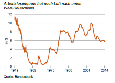 Aber die derzeitige Arbeitslosigkeit ist viel zu hoch, um allein damit erklärt werden zu können. Kaum einer wird sich erinnern, dass die Arbeitslosigkeit in Deutschland über viele Jahre schon einmal bei 1 % und darunter lag. Das war in den 60er bis Anfang der 70er Jahre (siehe Grafik). Gemessen daran wäre also noch viel Luft nach unten.