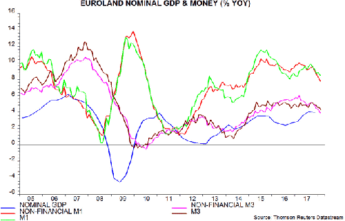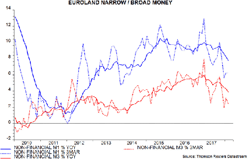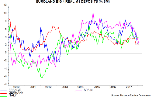 The ECB publishes a country breakdown of overnight deposits, which account for more than 80% of M1. Six-month growth of real deposits has fallen steeply in France and Spain since August-September 2017, converging with sluggish German expansion – fourth chart. Recent weaker French business surveys are consistent with the monetary slowdown and suggest that President Macron’s economic honeymoon period has ended. Italian real deposit growth, surprisingly, held up through February but increased policy risk following this month’s election could lower confidence / spending intentions and encourage capital flight, thereby weakening monetary trends.