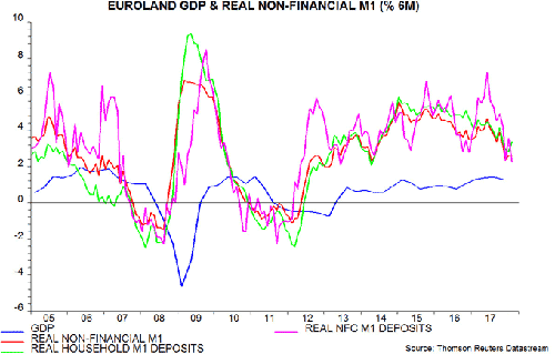The third chart shows six-month growth of real (i.e. deflated by consumer prices) non-financial M1 and household / corporate components. Aggregate growth is back around its level in late 2012 through early 2014, following which GDP grew at an annualised rate of 1.0-1.5% – well below current consensus and ECB forecasts. Corporate holdings have slowed particularly sharply in recent months and exhibited a stronger correlation with future GDP than household holdings historically, according to ECB research.