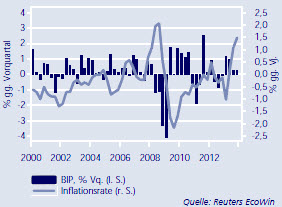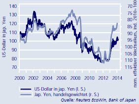 „Die ‚Abenomics‘ beinhalten eine vorübergehende expansive Fiskalpolitik, eine expansive Geldpolitik sowie Strukturreformen zur Verbesserung der Wettbewerbsfähigkeit“, erläutert Heinz-Gerd Sonnenschein, Volkswirt bei der Postbank. „Mit diesen drei Pfeilen will Abe Japan heraus aus der schon langanhaltenden Phase von Deflation und geringem Wachstum führen.“ Die ersten beiden Pfeile habe er schnell abgeschossen. Mit Erfolg: Der japanische Yen hat seit Abes Wahlsieg im Dezember 2012 um 22,6 Prozent gegenüber dem US-Dollar abgewertet. Und auch gegenüber einem Korb von 15 Währungen der wichtigsten Handelspartner des Landes tendiert der Wechselkurs seit Ende 2012 deutlich schwächer. Auch das Wirtschaftswachstum hat sich deutlich beschleunigt und seit Mitte 2013 weist Japan eine positive Preissteigerungsrate auf. Die Inflationsrate ist auf 1,6 Prozent gestiegen – das höchste Niveau seit sieben Jahren. In der Kernrate beläuft sich die Inflation aktuell auf 1,3 Prozent. „Das von Premier Abe und Bank of Japan ausgegebene Ziel, die Kernrate bis zum Frühjahr 2015 auf zwei Prozent anzuheben, ist damit zwar näher gerückt“, sagt Sonnenschein. „Erfolgreich ist die expansive Geldpolitik allerdings erst, wenn sie sich auch dauerhaft im Bereich von zwei Prozent einpendelt.“