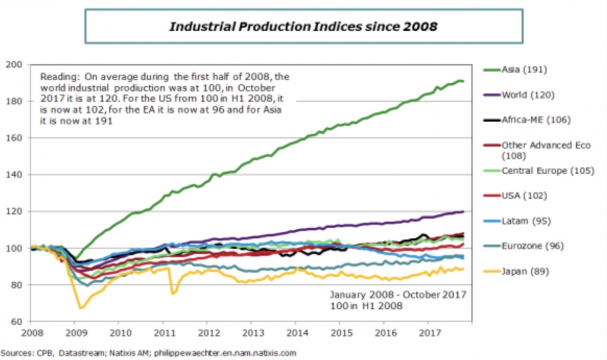 Aus wirtschaftlicher Sicht geht es für den Kontinent nicht mehr darum, einen Rückstand aufzuholen, wie dies 2016 und 2017 der Fall war. Die Wachstumsdynamik wird eine ganz andere sein und weit mehr vom weltweiten Umfeld abhängen. Anders gesagt, die Wirtschaftspolitik in Europa muss ihre Rolle wieder übernehmen und die einzelnen Volkswirtschaften müssen sich bei gleichzeitiger Steigerung der Effizienz neuen Rahmenbedingungen anpassen. Der andere Punkt ist, dass sich die Lage der Weltwirtschaft in dieser Zeit nach der Krise drastisch zu Gunsten Asiens verändert hat. Die nachstehende Grafik zeigt, dass diese radikale Veränderung parallel zur Krise verlaufen ist. Die entwickelten Länder sind nicht mehr der Antrieb für das weltweite Wachstum, so dass der Prozess, auf Schocks zu reagieren und damit umzugehen, schmerzlicher sein wird als zuvor, da diese Länder nicht mehr hauptsächlich wachstumsbestimmend sind und das Durchschnittswachstum geringer ausfällt.